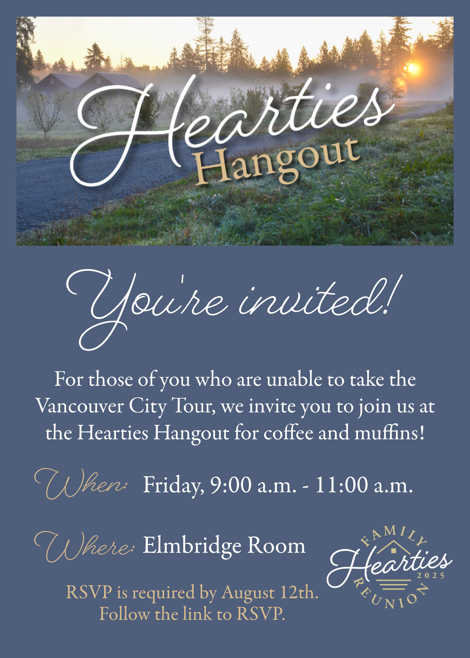 July 25, 2025: For Hearties who are unable to take the Vancouver City Bus Tour, we want to invite you to join us at the Hearties Hangout for coffee and muffins on Friday morning, September 12th! Stop by anytime between the hours of 9:00 a.m. and 11:00 a.m. This event does require an RSVP, so if you’ll be joining us click here and complete the form by August 12, 2025.