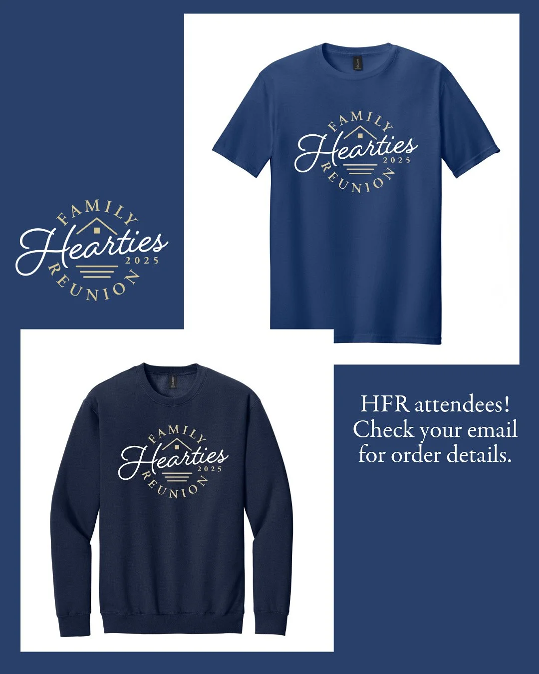 July 25, 2025: Hearties have clamored for years for us to offer a Hearties Family Reunion event shirt —and today, we can finally fulfill that wish! This years’s HFR logo features our show’s beloved row house and stoop. Now we can “come home to Hope Valley” wearing souvenir reunion shirts! IMPORTANT: If you are attending this year’s Hearties Family Reunion, an email was sent to you with specific links to follow to order to ensure you get your shirt(s) in time for HFR. If you are NOT attending, you may shop as usual from Edify Films.