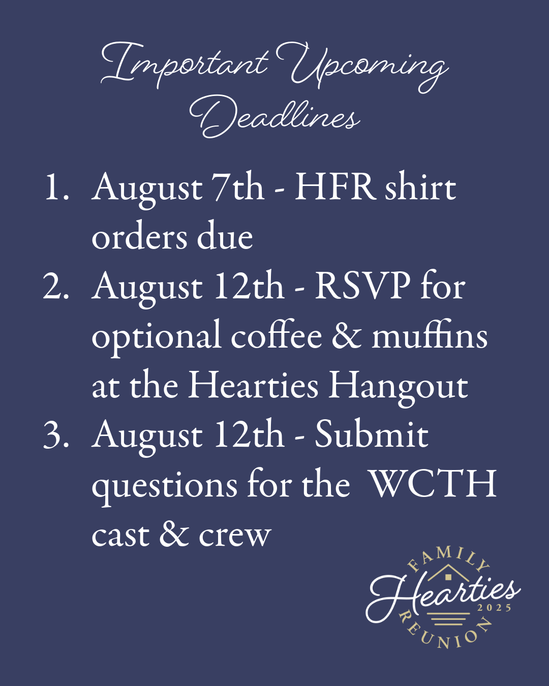May 16, 2025: 🎉 HFR is SOLD OUT! 🎉 Thank you, #Hearties, for the huge response to our Opportunity Drawing for this year’s Hearties Family Reunion. After all these years, we LOVE to see you as excited as ever about When Calls the Heart.
